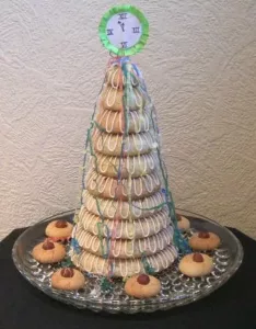 It is a scandinavian tradition to have “kransekage” and champagne at midnight New Years eve. “Kransekage” is made of almond paste, icing sugar and egg whites. I always make my own instead of buying one from my local baker, it also taste much better. This is the one I have made for our New Year…